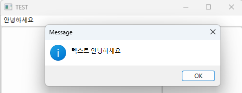 '메시지박스 띄우기' 버튼을 누르면 텍스트 박스에 있는 내용을 읽어서 화면을 띄우게 하였고, '끝내기' 버튼을 누르면 창을 닫게 하였습니다.