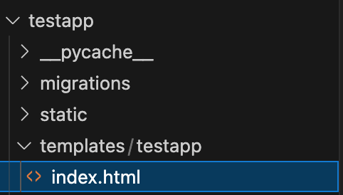 일단 앞서서 만든 testapp에 다음과 같이 templates 라는 폴더를 만들고 이곳에 app의 이름의 폴더를 만듭니다. 그리고 그안에 index.html 파일을 생성해 보겠습니다.