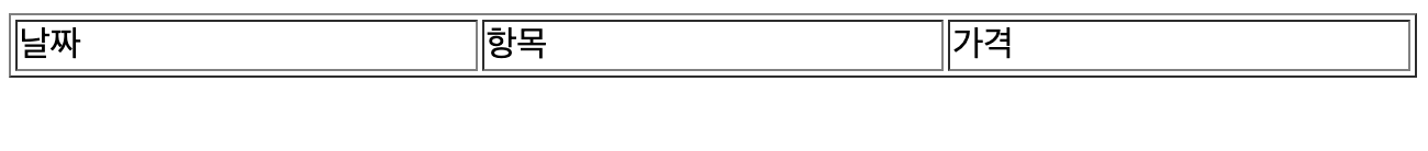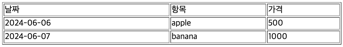 작업한 내용을 설명 드려보자면 table을 만들고, [날짜], [항목], [가격]이라는 컬럴을 만듭니다. 그리고 context를 통해 넘겨받은 items 리스트에서 date, name, price 순서로 데이터를 가져와 이를 그대로 뿌리는 template 입니다.