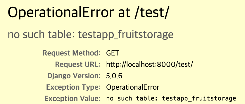 우리가 만든 FruiteStorage의 모든 object 리스트를 얻고 그 object들을 for문을 돌면서 items에 date, name, price 필드를 수집합니다. 화면에 뿌리기 편하게 date, price는 텍스트로 변환 후 수집하였습니다. 그 이후 items을 context를 통해 전송하였습니다. 이제 python manage.py runserver 명령을 통해 실행해 보겠습니다. 그럼 웹페이지에 다음과 같은 오류가 발생합니다.