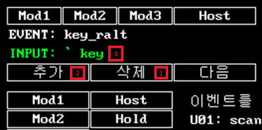 오른쪽 Alt를 마우스로 클릭하면 다음처럼 녹색으로 활성화 됩니다. 아래쪽을 보면 EVENT, INPUT이 보입니다. 이것에 대해 설명드리자면 EVENT는 INPUT을 눌렀을 때 동작하는 실제 기능을 의미합니다. Right Alt Key를 누르면 key_ralt (오른쪽 Alt)키가 동작한다는 의미입니다. 이것을 `키를 눌렀을 때 key_ralt가 동작하게 바꿔 보겠습니다.