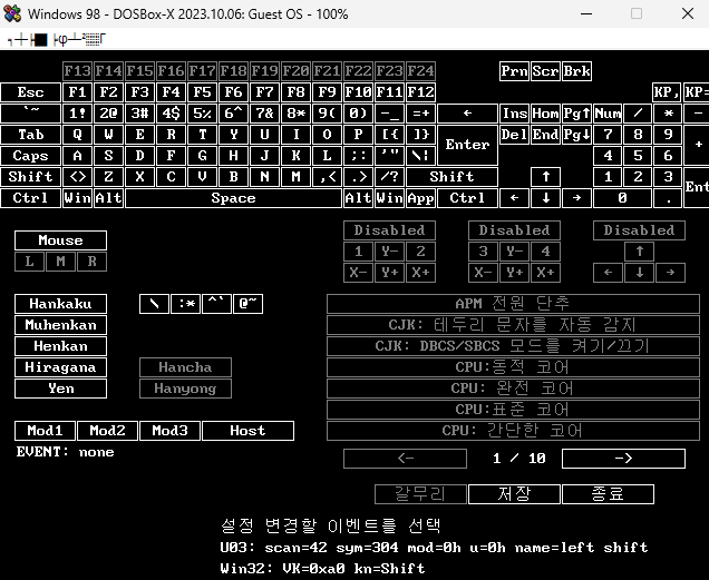 한/영 키를 눌렀을 때 우리가 원하는 것은 DOSBox-X에 한/영 키가 전달되는 것입니다. 이 문제는 DOSBox-X보다 메인 Windows가 키를 먼저 처리해서 생기는 현상입니다. DOSBox-X는 한/영 키를 받지 못한 거죠. 이를 해결하기 위해서는 한/영 키를 다른 것으로 설정해야 합니다. 하지만 Windows 98SE에서는 한/영 키를 바꿀 수 없습니다. 아래와 같은 오른쪽 Alt로 고정되어 있죠.