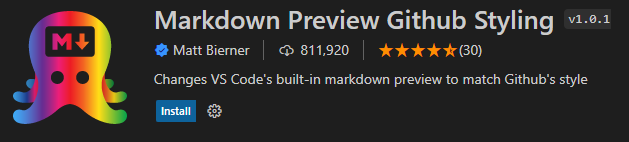 또한 저는 VS Code에서 Markdown 스타일이 GitHub 좀 다르게 표시되어 Markdown Preview Github Styling 확장도 추가로 설치하였습니다. 사실 이것도 같지는 않으나 조금 더 나은 편이긴 해서 깔았습니다.