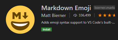 VS Code에서 이모지를 쓰려면 확장을 설치해 주셔야 합니다. 저는 Markdown Emoji 확장을 쓰고 있습니다. Ctrl+Shift+X를 누르셔서 Extentions로 진입 후 해당 이름을 검색하셔서 설치해 주시면 됩니다. 물론 더 좋은 것이 있어보이면 다른 걸 사용하셔도 됩니다.