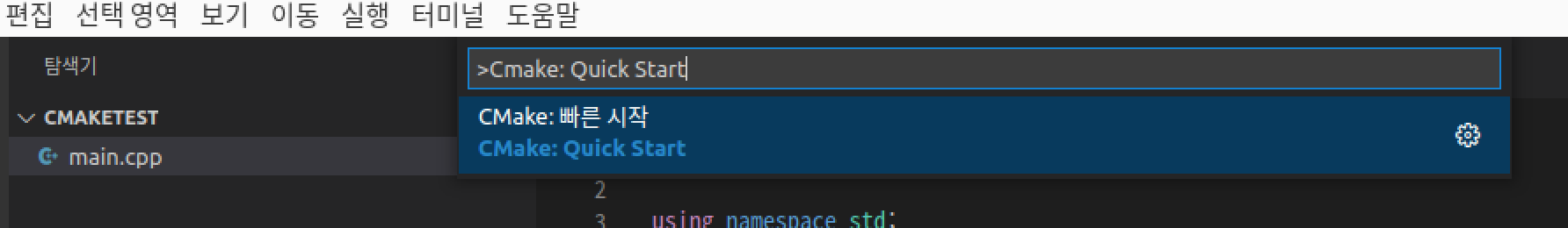 이제 VSCode에서 Ctl+Shift+P를 누르면 명령 팔레트(Command Palette)가 실행됩니다. 명령 팔레트는 다음과 같이 직접 명령어를 입력하여 빠르게 원하는 명령을 찾는데 사용됩니다. 메뉴를 이동해서 클릭하는 것보다 빠르게 찾을 수 있는 경우가 많아서 종종 사용하시면 편리하실 겁니다. 여기서 CMake: Quick Start 를 찾습니다.