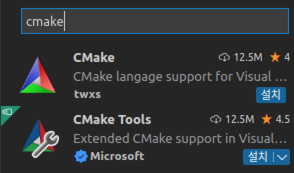 이후 다음의 CMake 관련 확장들을 설치해 줍니다. CMake와 CMake Tools입니다.