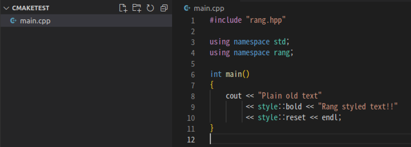 그리고 다음과 같이 빈폴더를 만들고 main.cpp 파일 하나 추가 후 테스트코드를 만들어 보았습니다. (이 코드는 range gitHub의 ReadME.md 파일에 있는 예제입니다. (참고)https://github.com/agauniyal/rang)